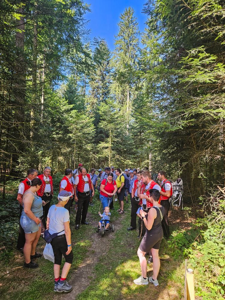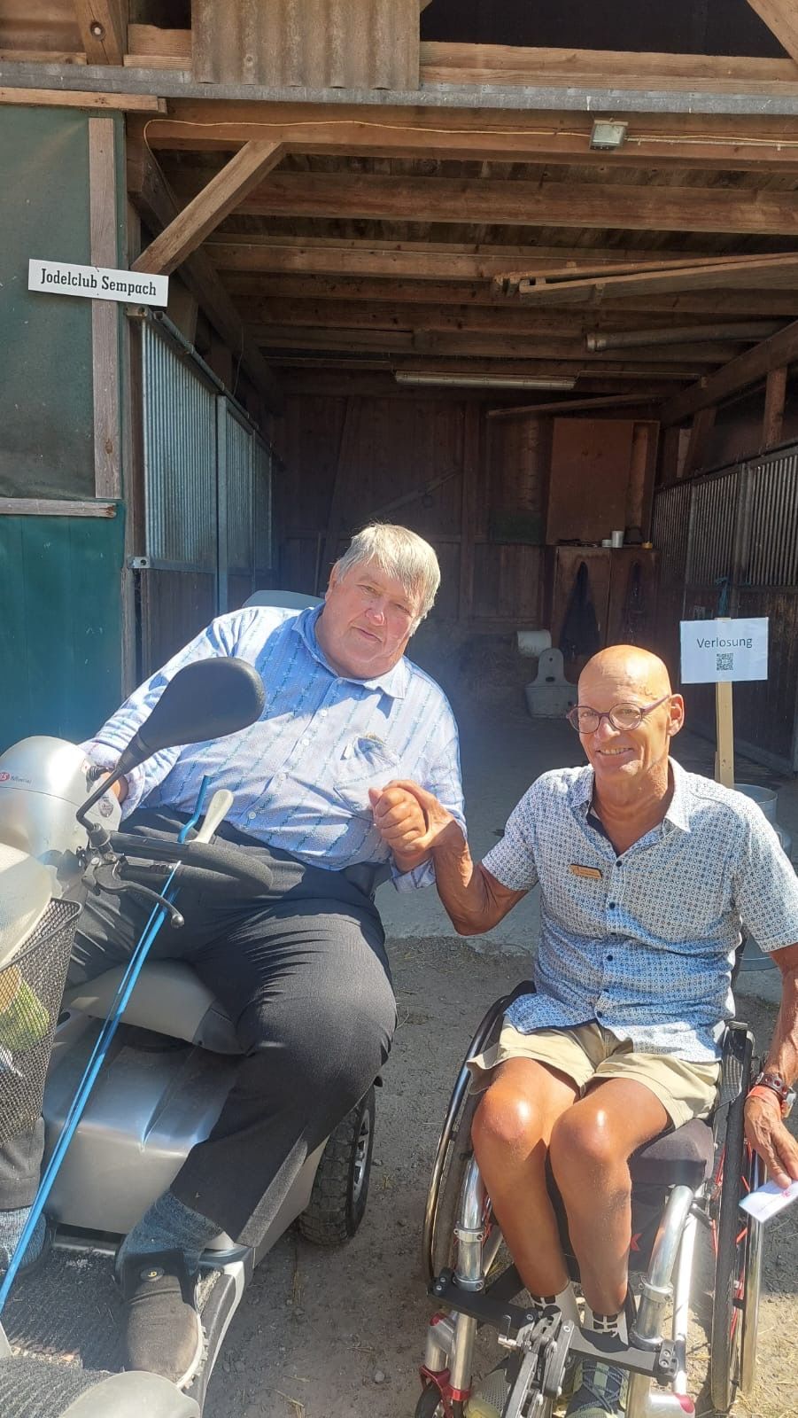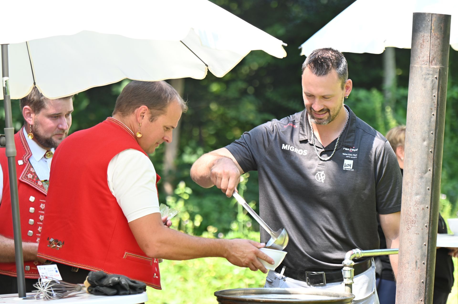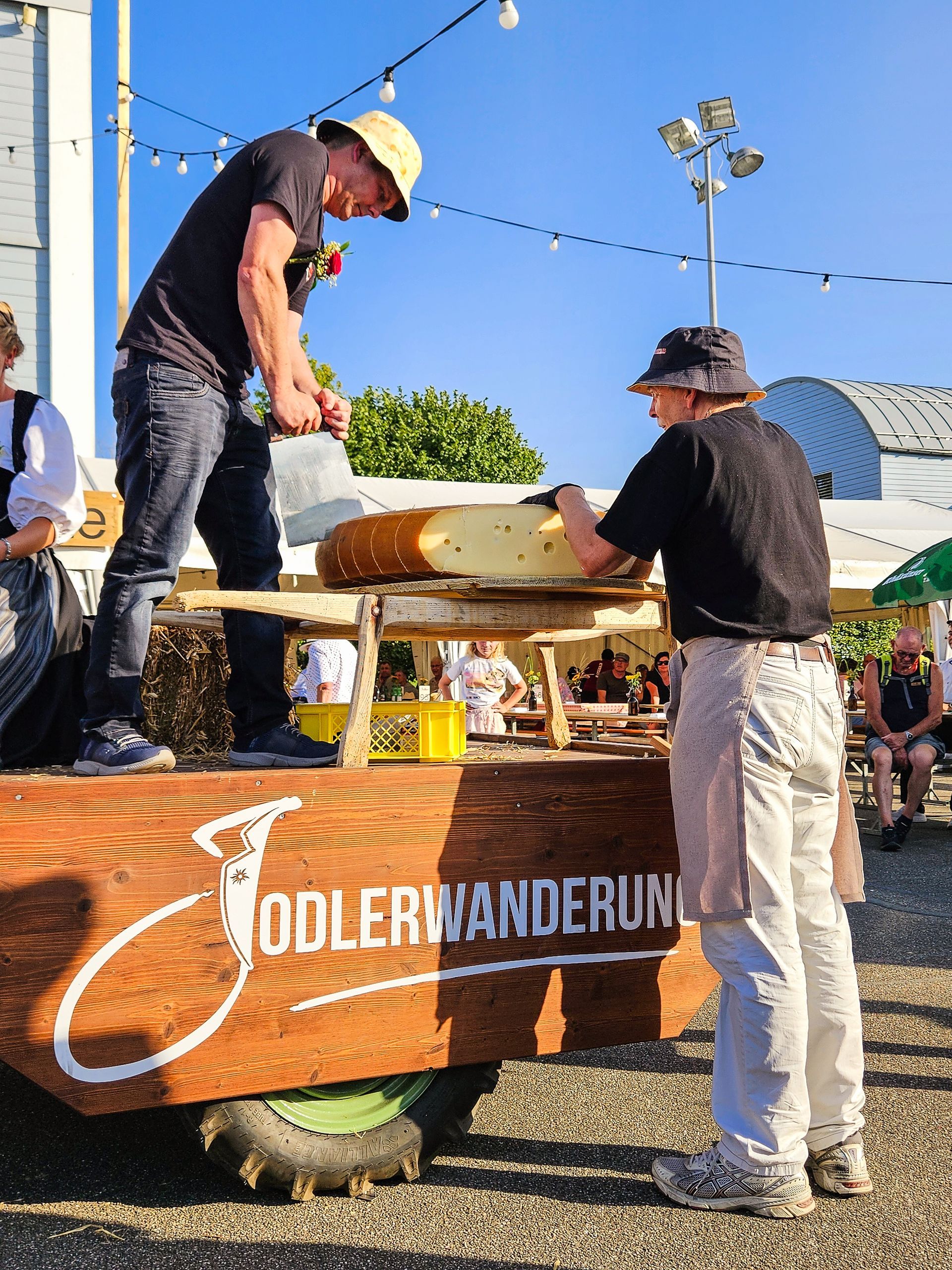 Der Höhepunkt der Wanderung bildete die urchige Chästeilet rund um den Käsegötti bzw. mehrfachen paralympischer Sieger Heinz Frei. Der Emmentaler Käse-Laib, welcher grosszügigerweise welcher grosszügigerweise von der Emmentaler Dorfkäserei AG und Emmentaler AOP gesponsert wurde, konnte erfolgreich versteigert werden. Der Erlös aus dem Verkauf des Käses, welcher seit seiner Taufe im Mai 2025 den Namen «Para-Rugeli» trug, geht auf Wunsch des Käsegöttis an das Parra Racing Team. Heinz Frei konnte übrigens die Wanderung trotz Rollstuhl ebenfalls meistern und die Kulinarik sowie die dargebotene Kunst der Jodlerklubs in bester Begleitung geniessen. Er war angetan von der ungezwungenen Geselligkeit und der Atmosphäre, die die Besuchenden und die Klubs ausstrahlten.